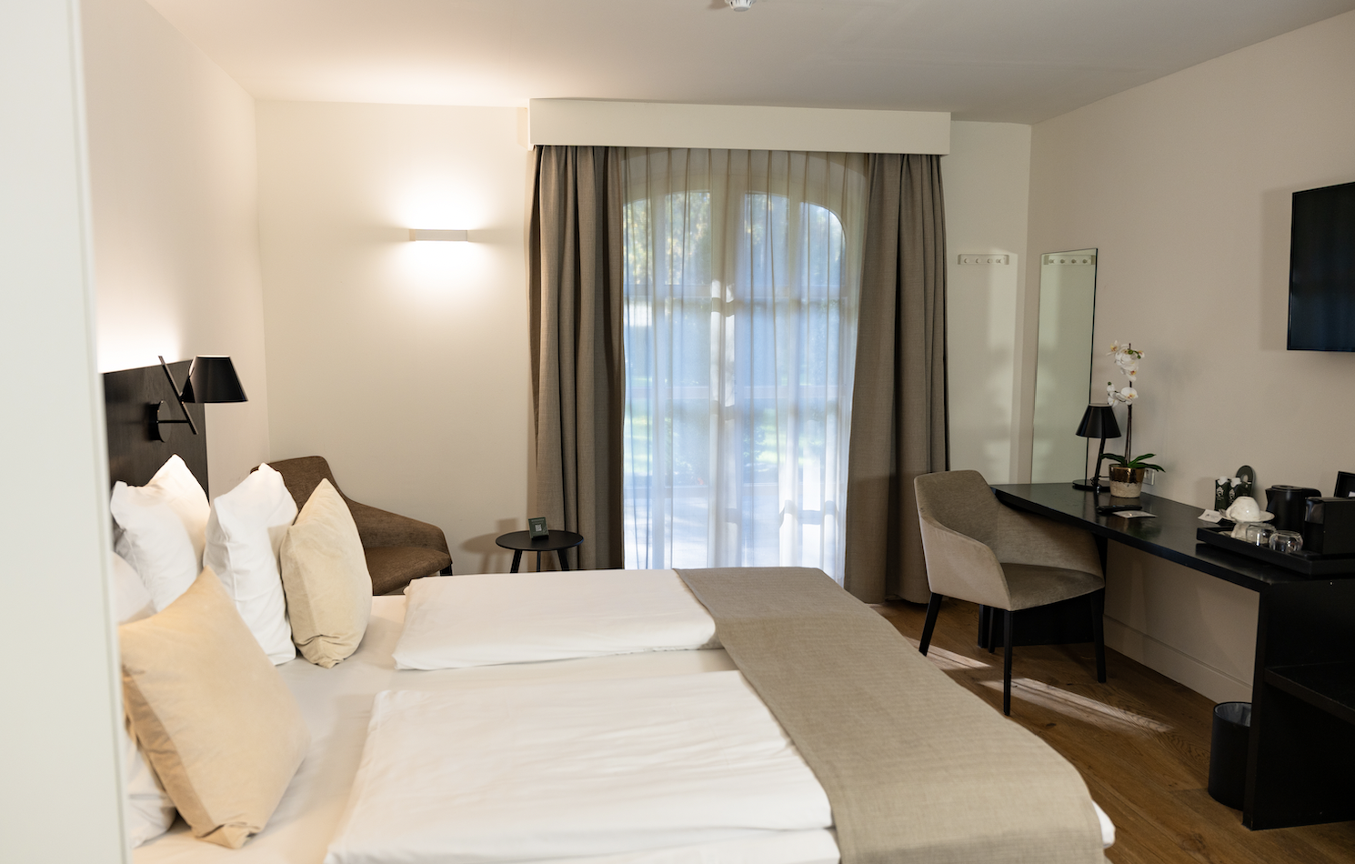 De ruime Suites (38 m²) zijn voorzien van een tweepersoonsbed of 2 eenpersoonsbedden, zithoek, bureau, gratis WiFi, 40 inch flatscreen televisie, telefoon, kluis, airconditioning, minibar, koffie- en theefaciliteiten, verwarming, badjas en pantoffels en badkamer met bad, inloopdouche, toilet, wastafel, föhn en toiletartikelen.