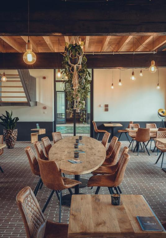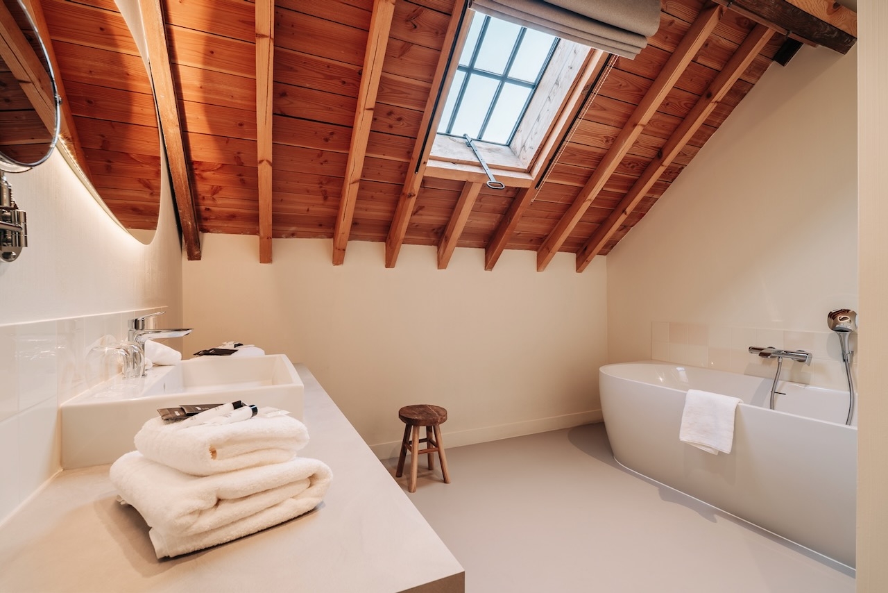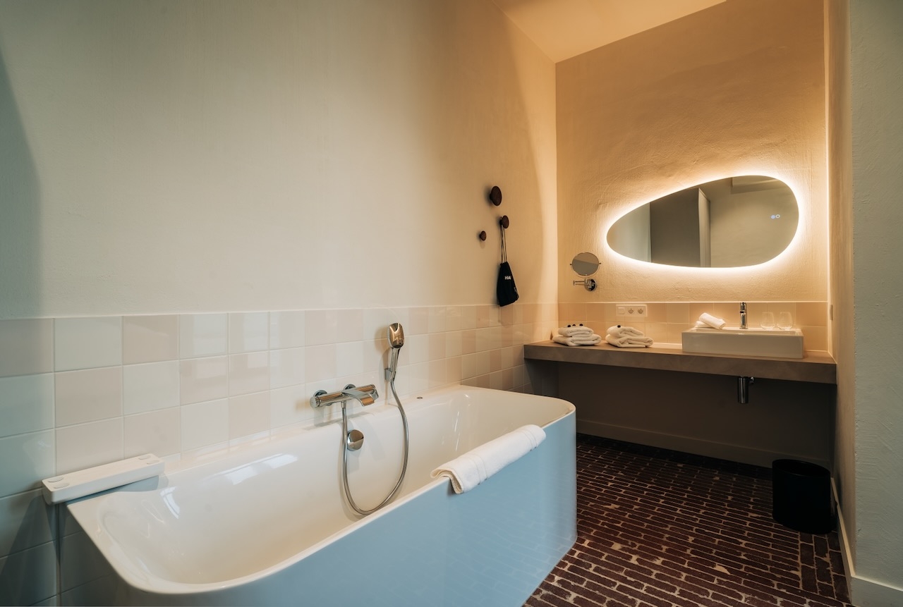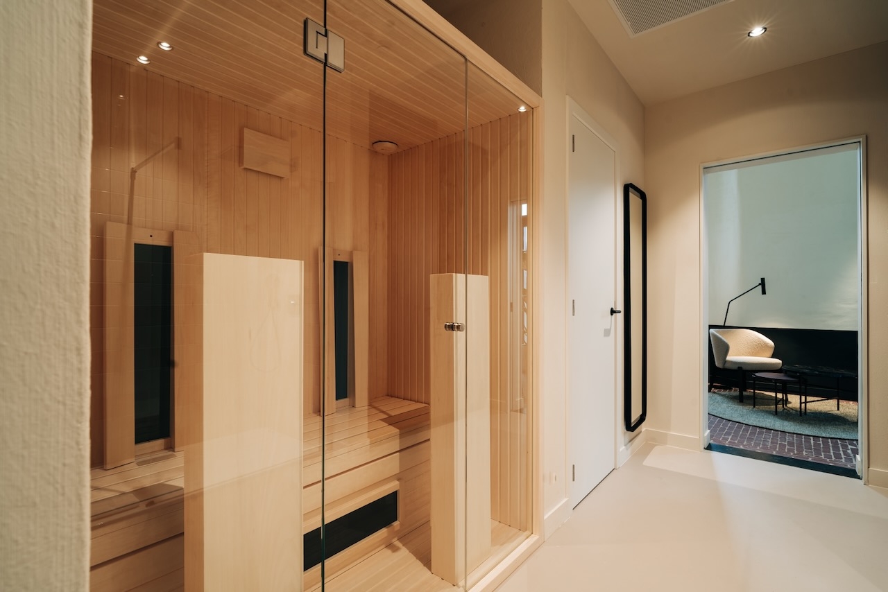 De ruime, stijlvolle Wellness suites (50 m²) hebben uitzicht op de tuin en zijn voorzien van sauna, terras, 1 tweepersoonsbed, zithoek, televisie, wifi, bureau, kluisje, koffie- en theefaciliteiten, koelkast, airconditioning, verwarming, kast, badjassen, slippers en badkamer met inloopdouche, bubbelbad, toilet, wastafel, haardroger en gratis toiletartikelen.