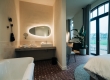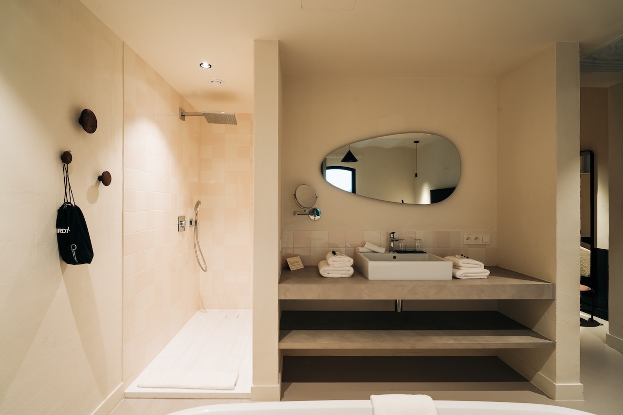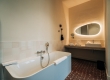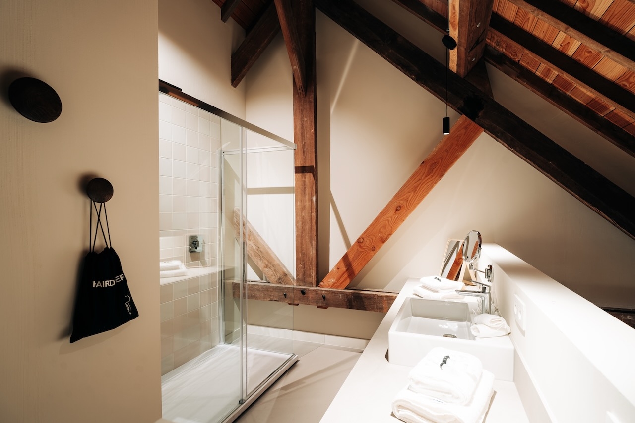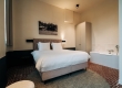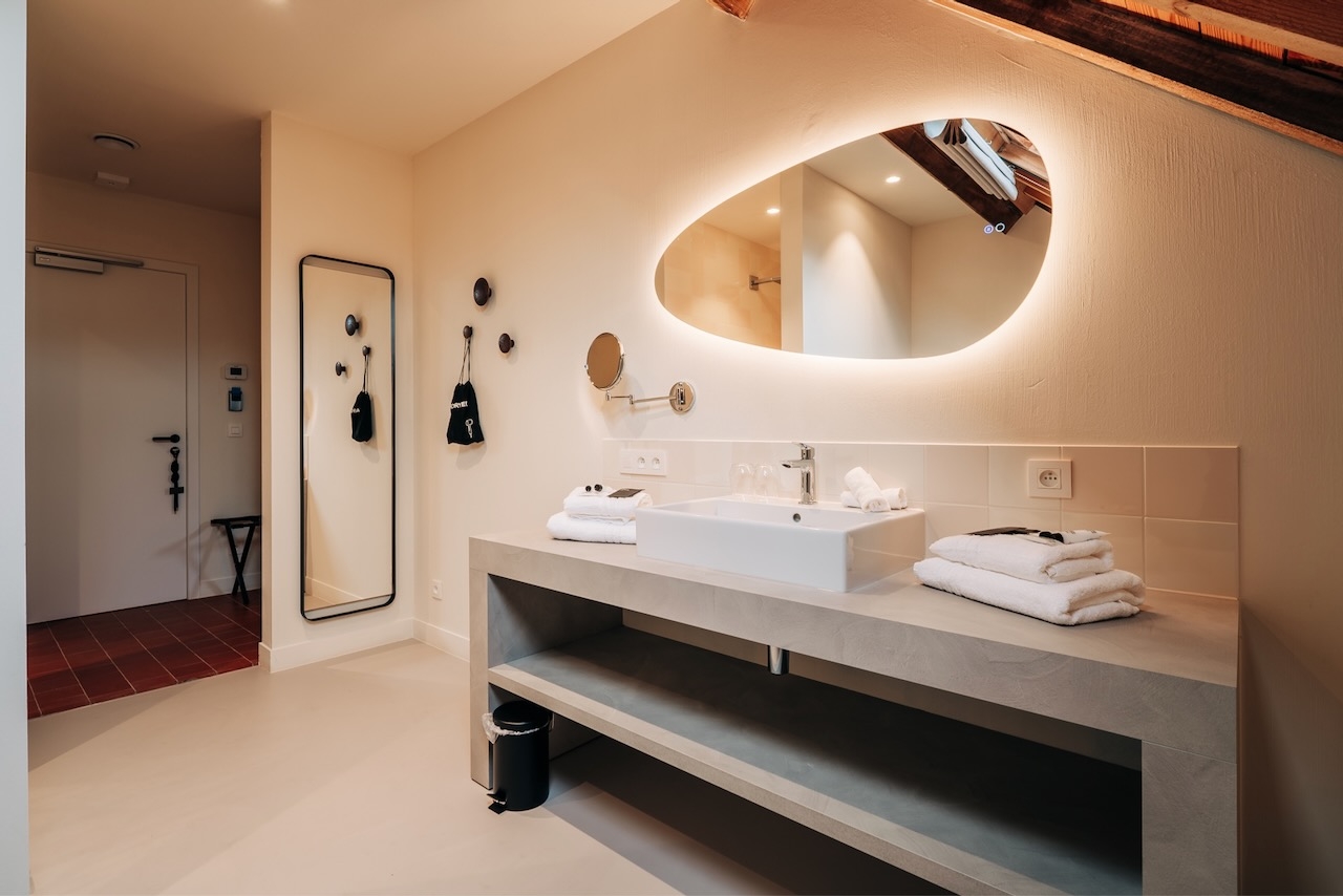 De ruime, stijlvolle Wellness suites (50 m²) hebben uitzicht op de tuin en zijn voorzien van sauna, terras, 1 tweepersoonsbed, zithoek, televisie, wifi, bureau, kluisje, koffie- en theefaciliteiten, koelkast, airconditioning, verwarming, kast, badjassen, slippers en badkamer met inloopdouche, bubbelbad, toilet, wastafel, haardroger en gratis toiletartikelen.