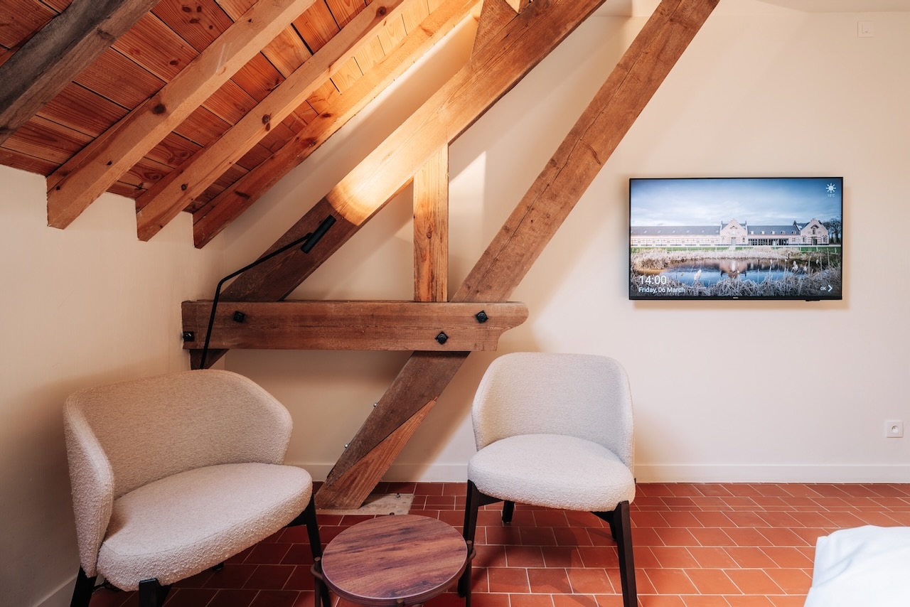 De ruime, stijlvolle Junior suites (45 m²) hebben uitzicht op de tuin of de binnenplaats en zijn voorzien van 1 tweepersoonsbed, zithoek, televisie, wifi, bureau, slaapbank, kluisje, koffie- en theefaciliteiten, koelkast, airconditioning, verwarming, kast en badkamer met inloopdouche, bad, toilet, wastafel, haardroger en gratis toiletartikelen.