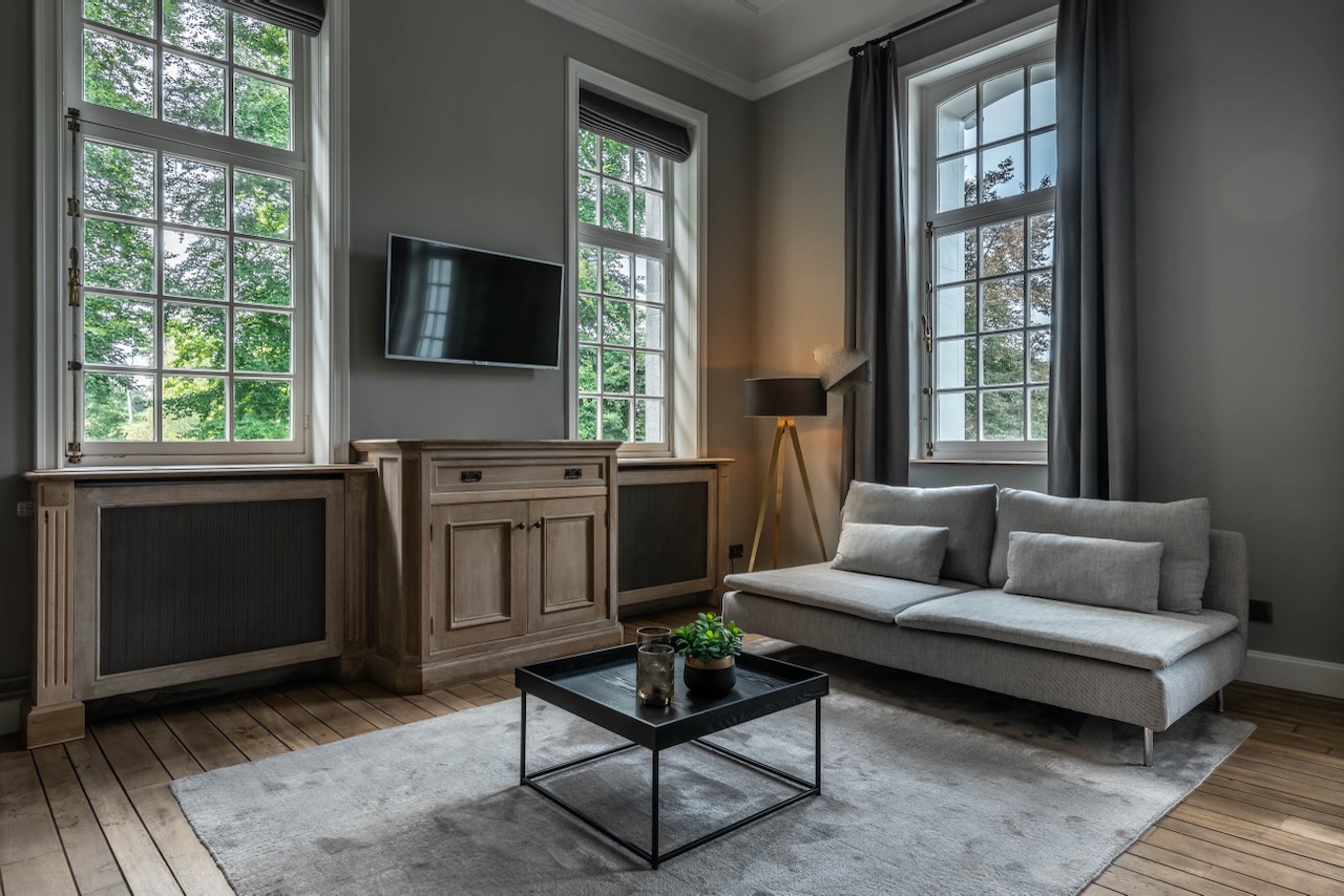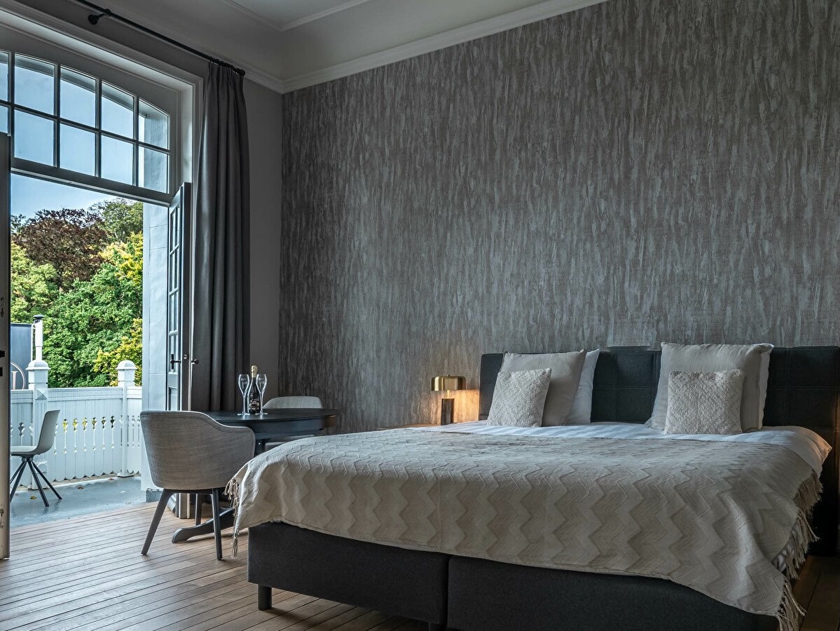 De riante, luxe King suite (ca. 45 m2) biedt een balkon met fantastisch uitzicht over de tuinen, ligt op de 1e verdieping van in het "kasteel" gedeelte van het hotel en heeft 2 schouwen en hoge plafonds. Deze Suite is voorzien van 1 tweepersoonsbed (kingsize, 200x210), lounge gedeelte met zithoek, airconditioning, inloopkast, telefoon, koffie- en theefaciliteiten, kluisje, minibar met Altenbroek water, flatscreen televisie, wifi en royale badkamer met vrijstaand bad, ruime inloopdouche, wastafel, toilet en haardroger.