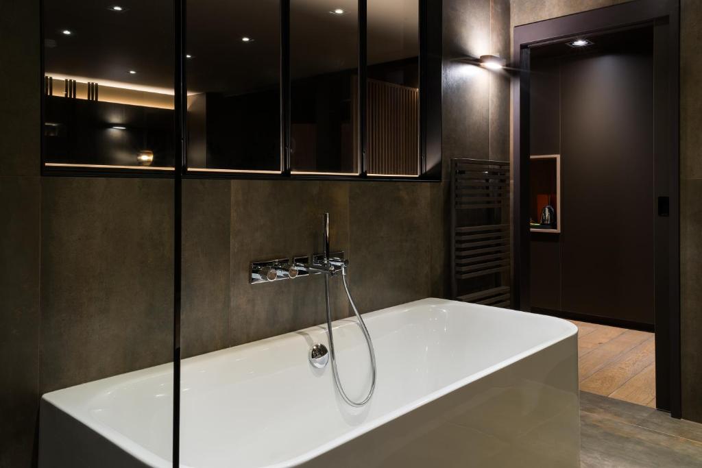 Het zeer ruime Suite Appartement (ca. 55 m2) heeft een eiken parketvloer en is voorzien van 1 tweepersoonsbed met beddengoed van hoge kwaliteit, zithoek met slaapbank, ingerichte kitchenette, koelkast, airconditioning, flatscreen televisie, bureau, wifi, minibar, koffie- en theefaciliteiten, apart toilet, kluisje en badkamer met bubbelbad, douche, wastafel, haardroger en toiletartikelen.
