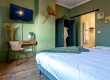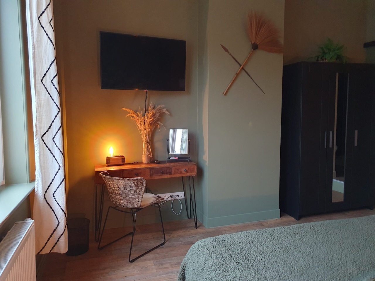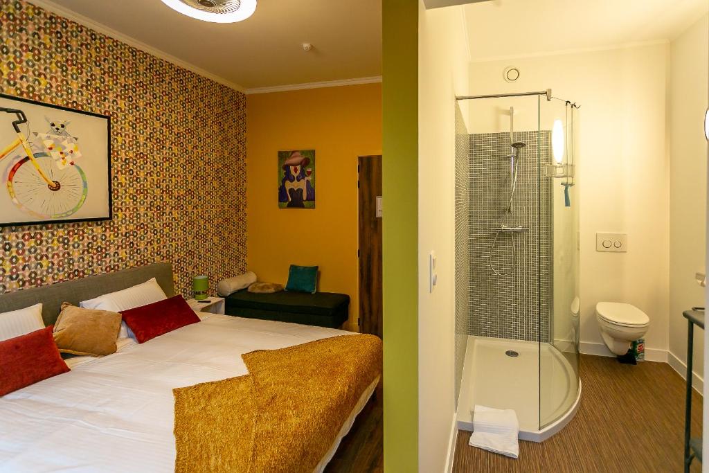 De luxe Optimist kamer is ingericht met inspirerende kleuren en belevenissen en voorzien van 1 tweepersoonsbed, bureau, verwarming, ventilator, wifi, televisie, badjassen, slippers en badkamer met inloopdouche, toilet, wastafel, haardroger en toiletartikelen.