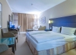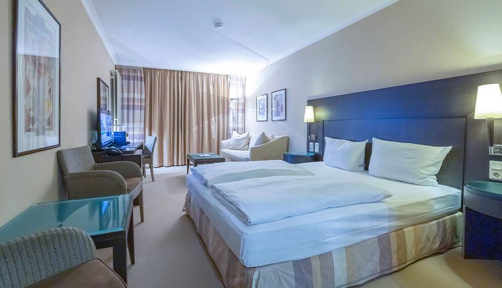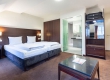 De ruime Luxe kamers (34 m2) zijn voorzien van 1 tweepersoonsbed, bureau, kluis, televisie, wifi, make-up spiegel, slaapbank en badkamer met douche, toilet, wastafel en haardroger.