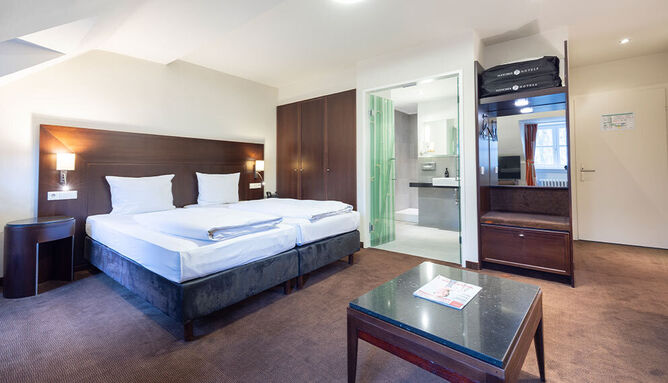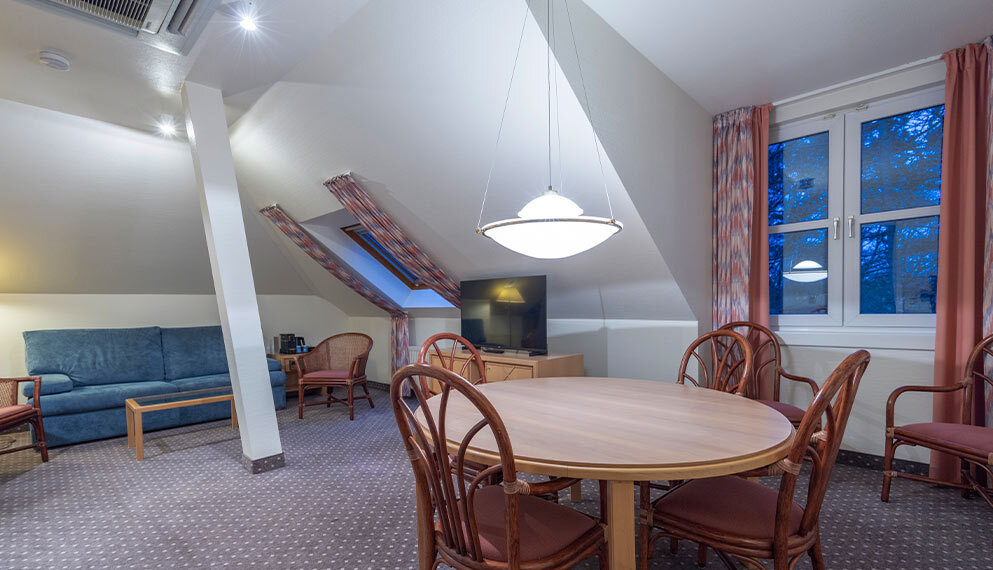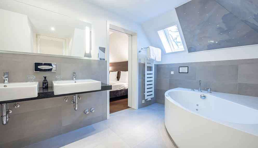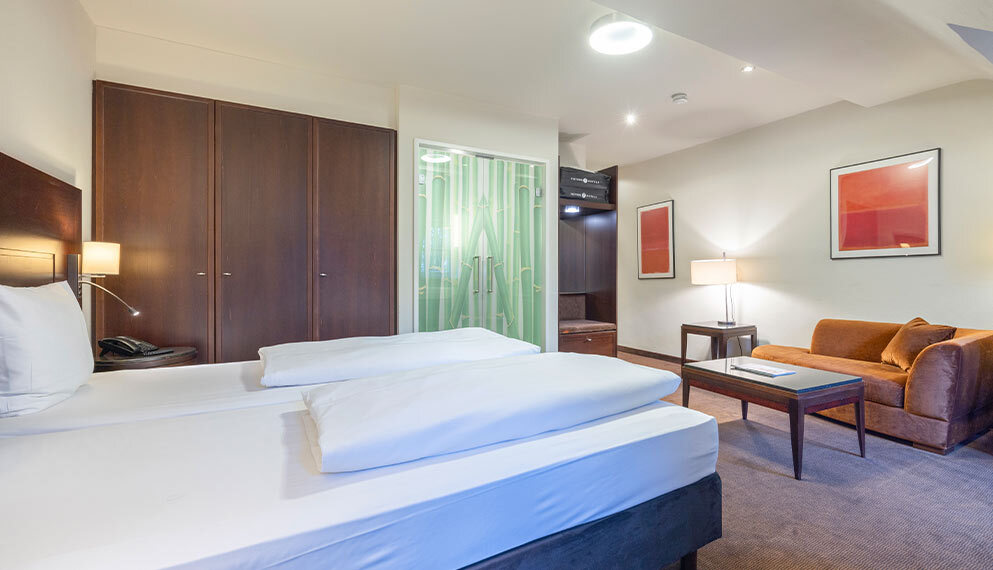 De zeer ruime Suite (60 m2) is voorzien van 1 tweepersoonsbed, bureau, kluis, televisie, wifi, make-up spiegel, slaapbank en badkamer met douche en/of bad, toilet, wastafel en haardroger.