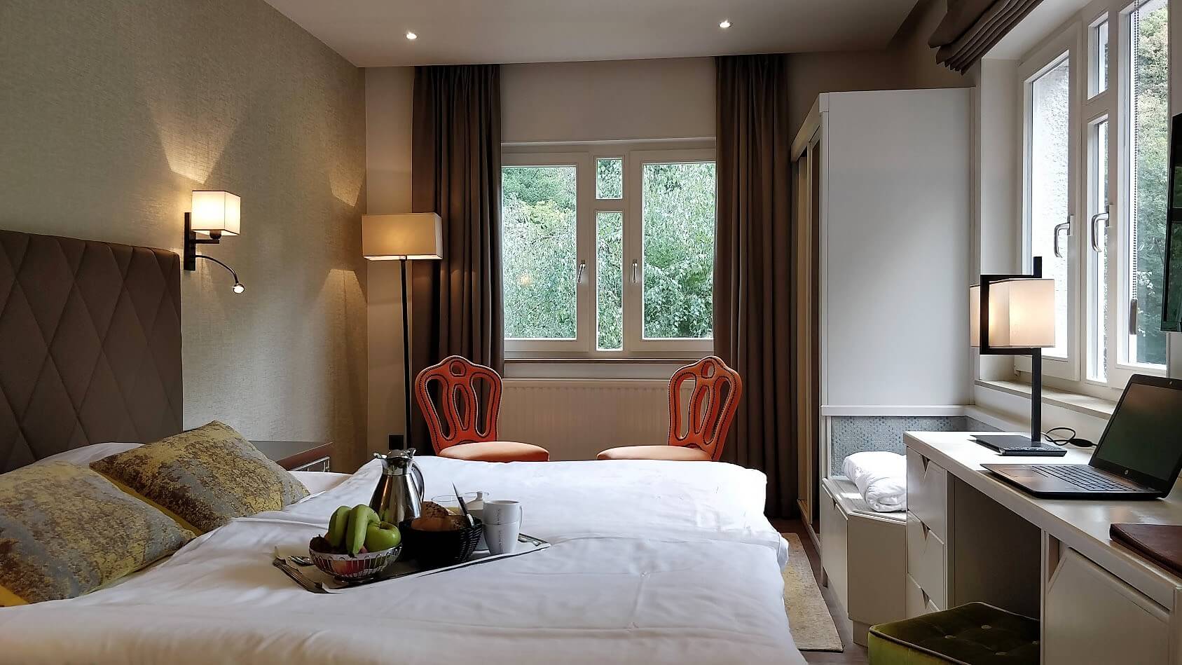 De Charme kamers (ca. 20 m2) hebben een mooi uitzicht en zijn voorzien van Queensize tweepersoonsbed van Auping, gratis WiFi, flatscreen televisie, minibar, bureau, verwarming, anti-allergische vloerbedekking, telefoon, radio, wekker, verwarming en badkamer met douche, toilet, wastafel en haardroger.