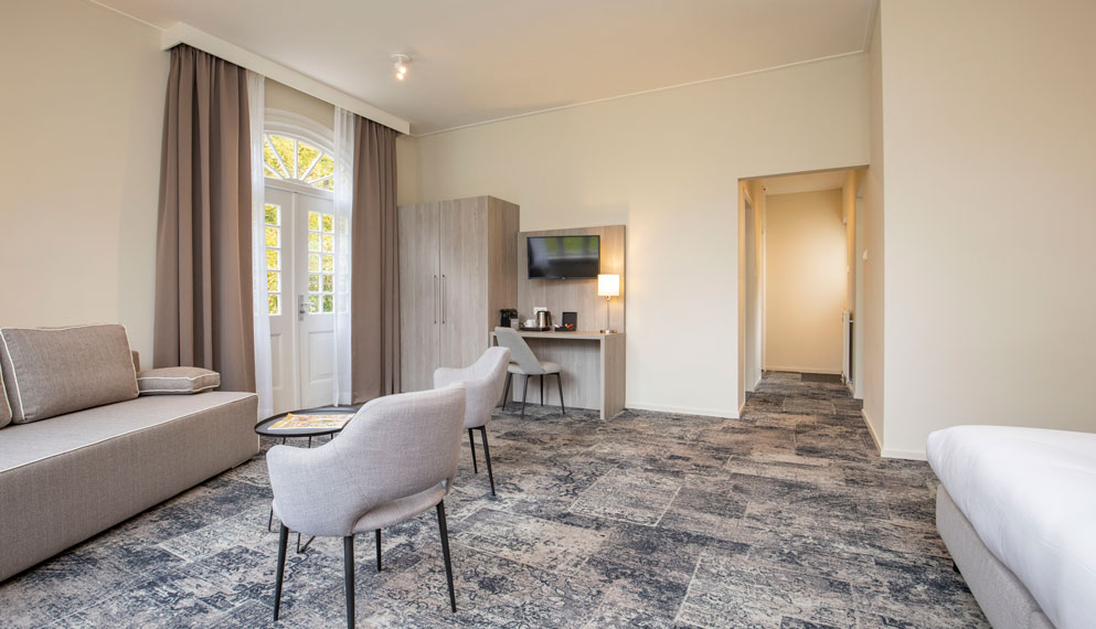 De ruime Familie Suite (30 m2) bevindt zich in het aangrenzende koetshuis en is voorzien van terras, 1 tweepersoonsbed, 2 eenpersoonsbedden, zithoek, bureau, kluis, slaapbank, wifi, televisie, koffie- en theefaciliteiten en badkamer met douche, toilet en wastafel.
