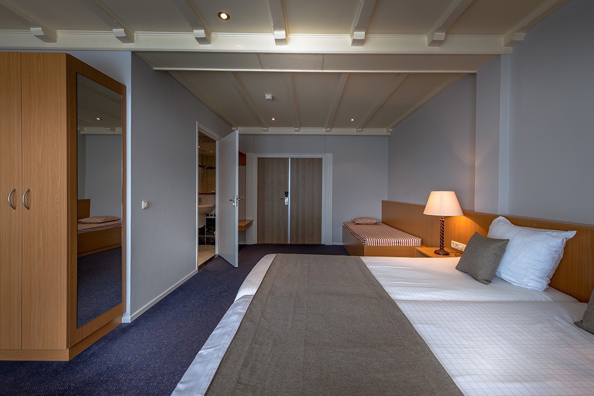 De gezellig ingerichte Comfort Plus kamers (30 - 40 m²) zijn voorzien van 2 eenpersoons boxspringbedden, wifi, zitje, bureau, verwarming, kluisje, flatscreen televisie, radio, koffie- en theefaciliteiten, badjassen en badkamer met bad en/of inloopdouche, toilet, wastafel, haardroger en toiletartikelen.