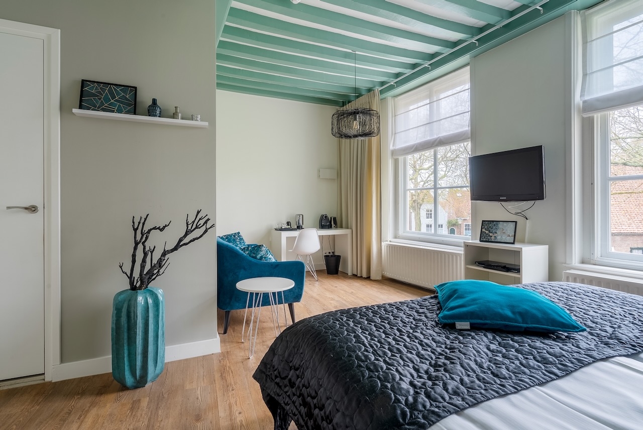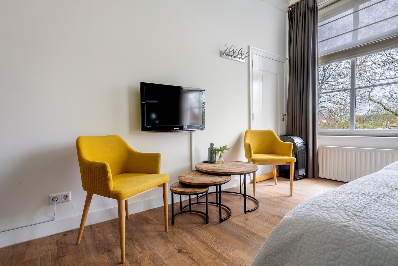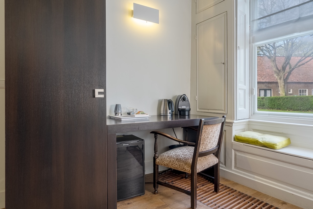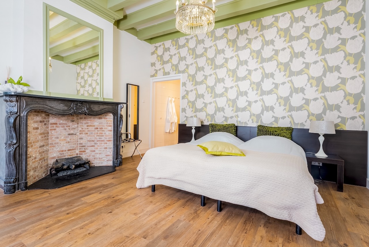 De ruime Luxe kamer (36 m²) ligt op de begane grond aan de voorzijde van het gebouw, heeft een sfeervolle (nep)openhaard in een authentieke schouw en is voorzien van de originele luiken voor de vensters, 1 tweepersoonsbed, flatscreen televisie met Netflix, zithoek, koffie- en theefaciliteiten, koelkast, badjassen en grote badkamer met bubbelbad, aparte inloopdouche, toilet en wastafel.