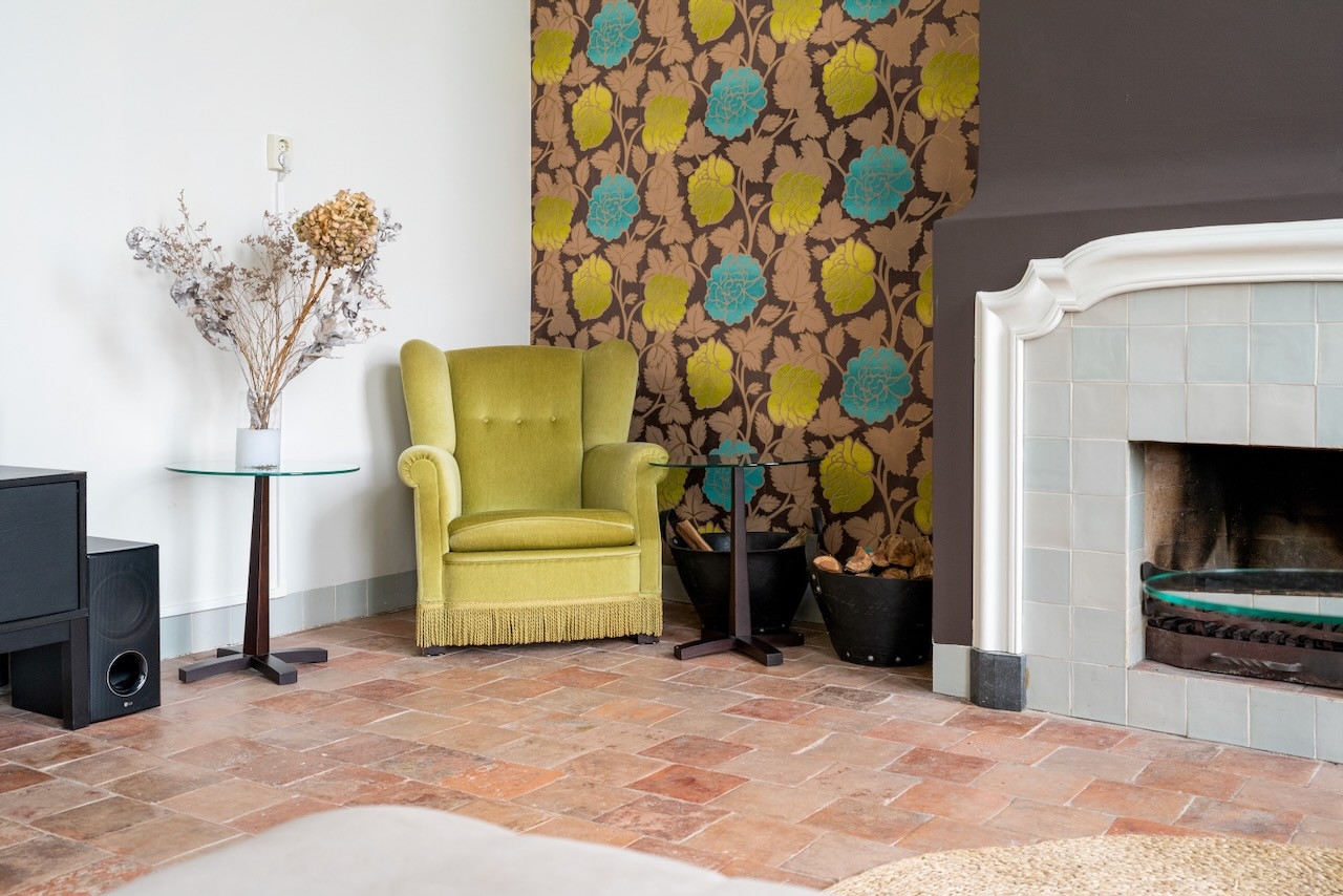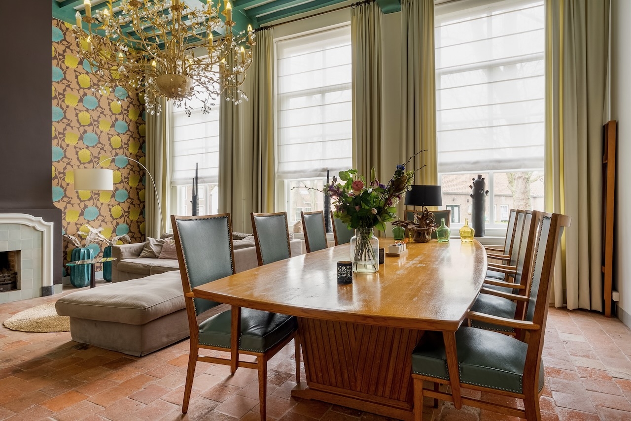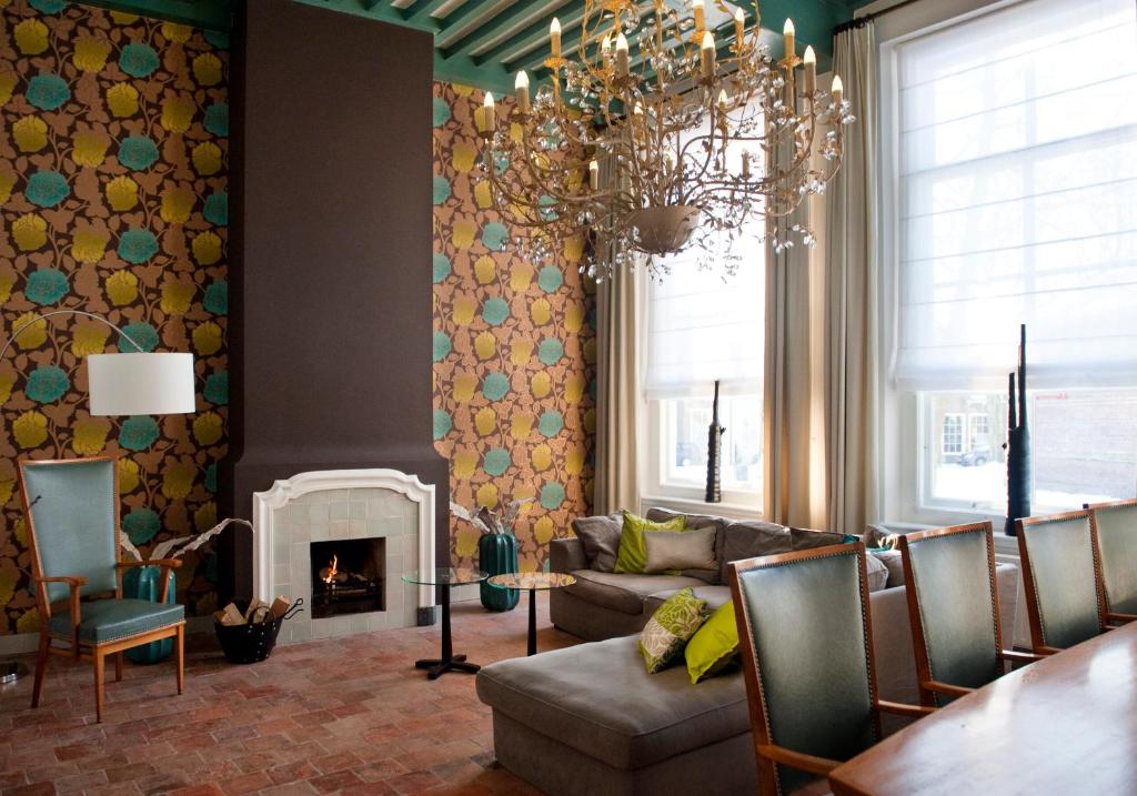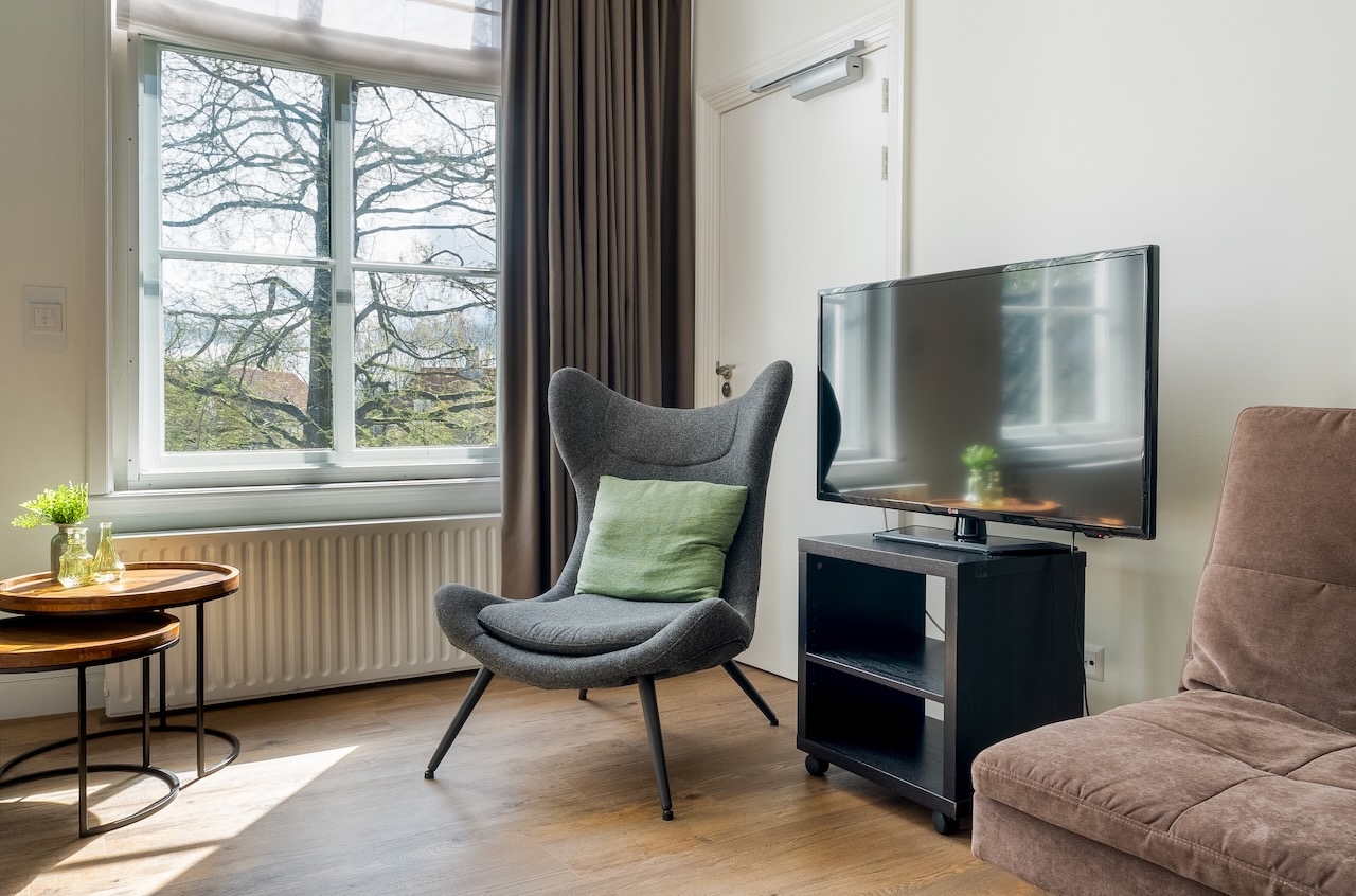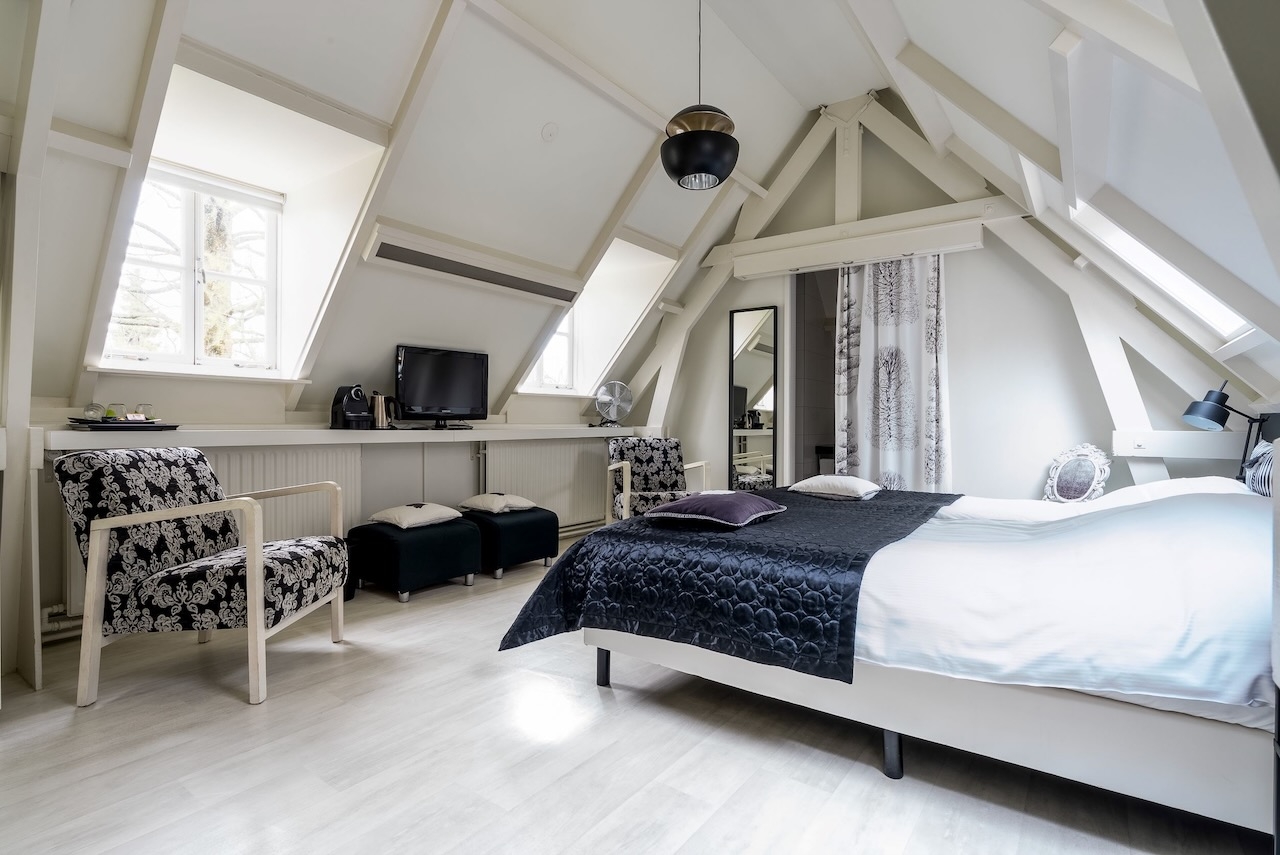 De ruime Luxe kamer (36 m²) ligt op de begane grond aan de voorzijde van het gebouw, heeft een sfeervolle (nep)openhaard in een authentieke schouw en is voorzien van de originele luiken voor de vensters, 1 tweepersoonsbed, flatscreen televisie met Netflix, zithoek, koffie- en theefaciliteiten, koelkast, badjassen en grote badkamer met bubbelbad, aparte inloopdouche, toilet en wastafel.