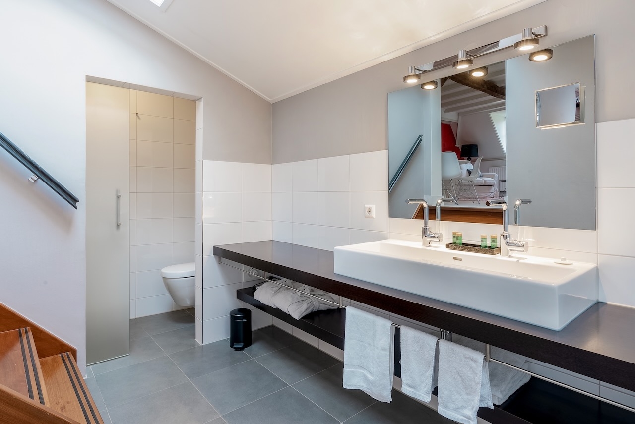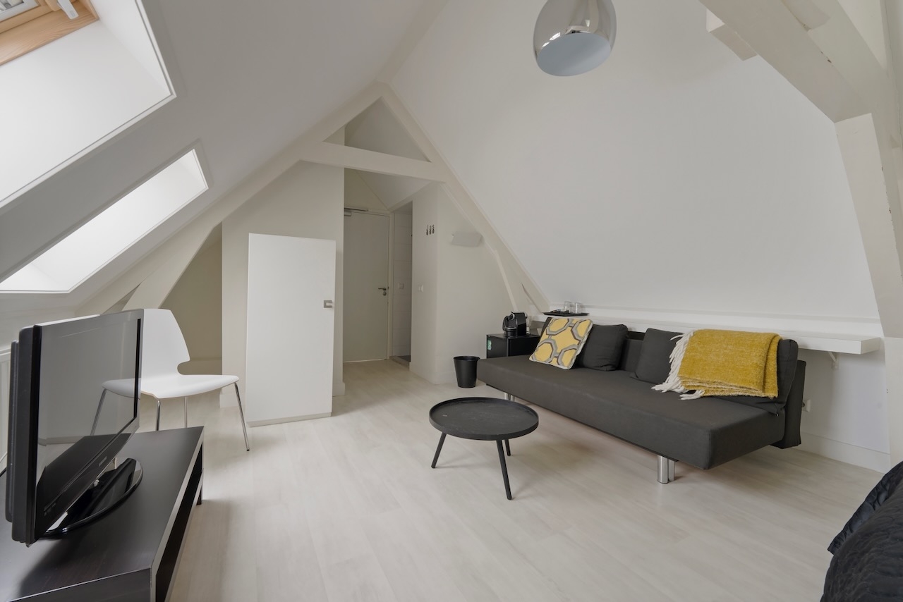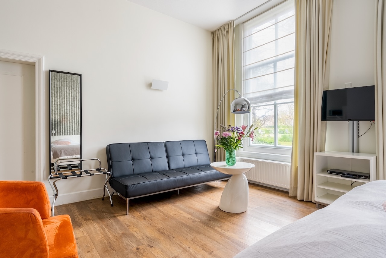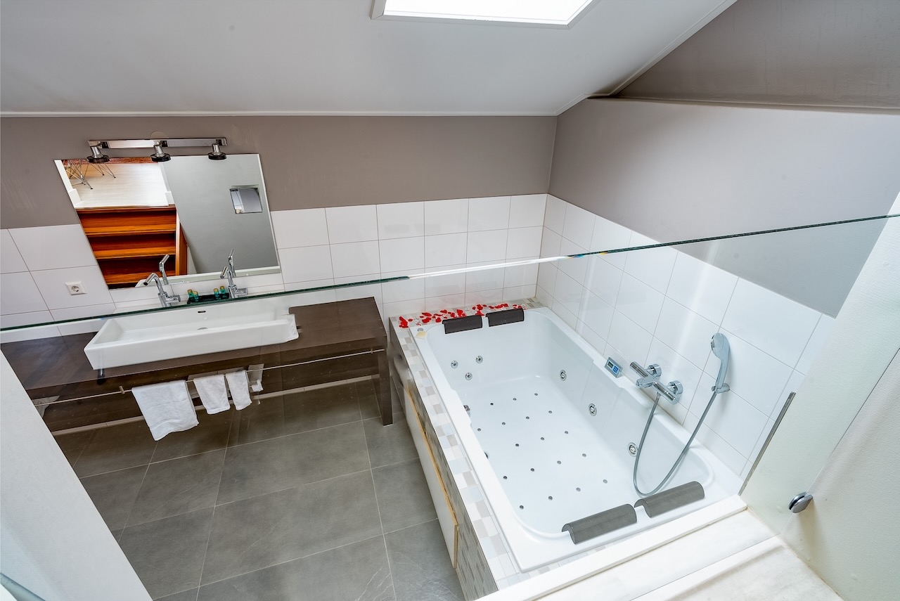 De zeer ruime Suite (50 m²) is voorzien van 1 tweepersoonsbed, televisie met Netflix, zithoek, slaapbank, kluis, kitchenette, koffie- en theefaciliteiten, koelkast en badkamer met bubbelbad, regendouche, toilet en wastafel.