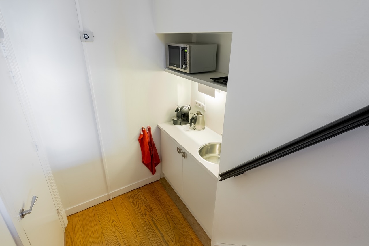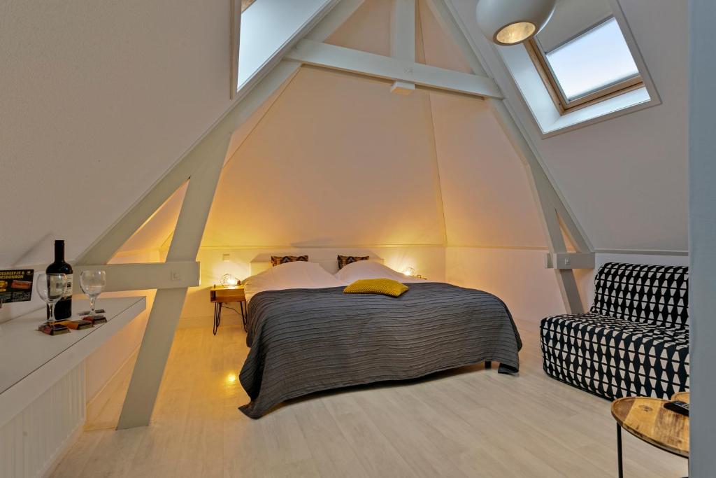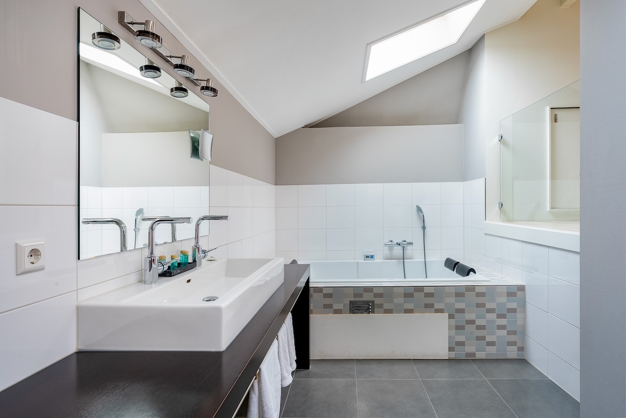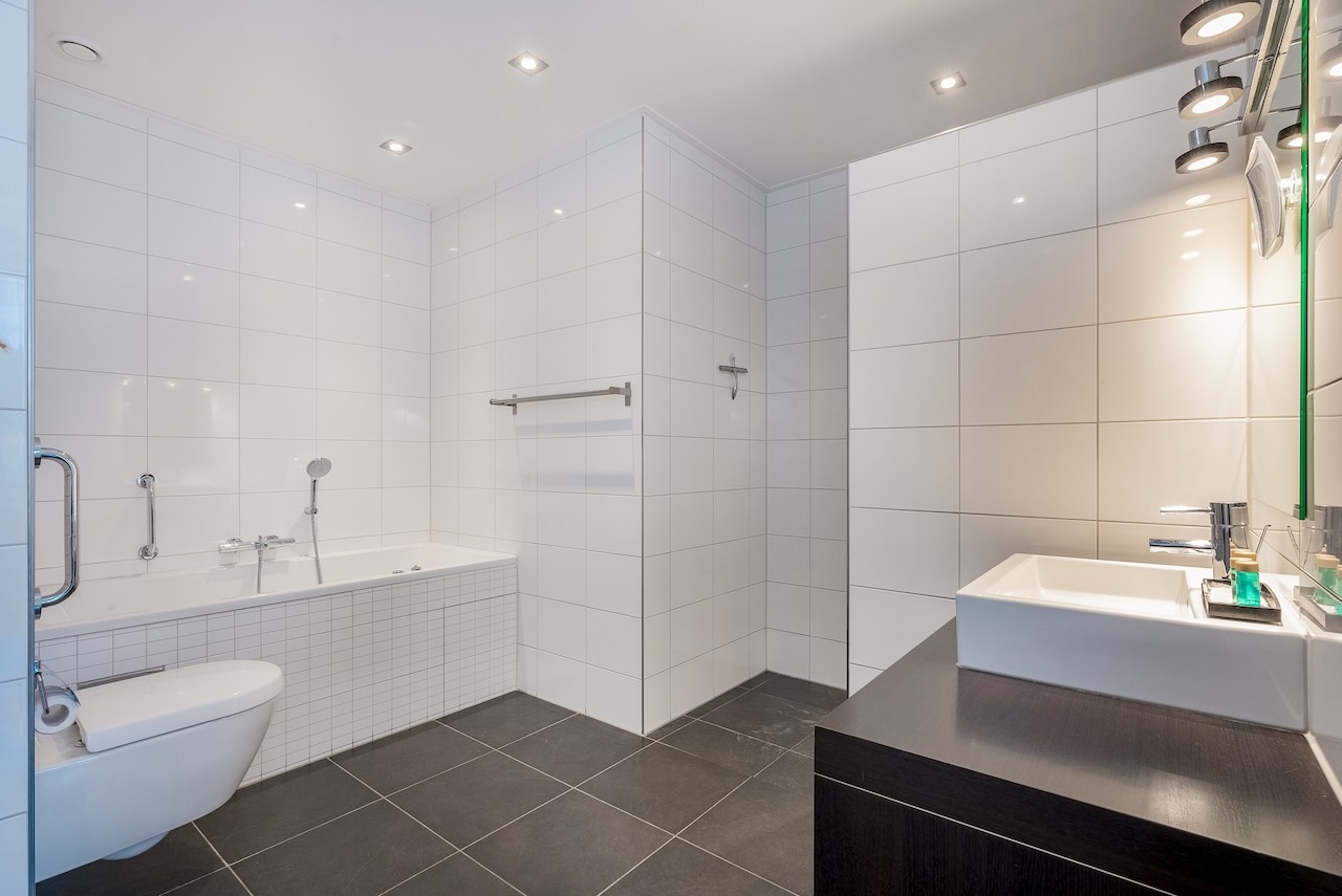 De zeer ruime Suite (50 m²) is voorzien van 1 tweepersoonsbed, televisie met Netflix, zithoek, slaapbank, kluis, kitchenette, koffie- en theefaciliteiten, koelkast en badkamer met bubbelbad, regendouche, toilet en wastafel.